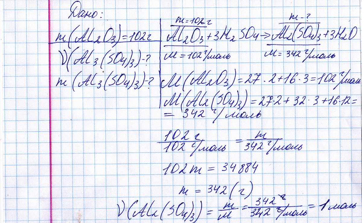 рассчитайте количество (моль) и массу соли, образующейся при взаимодействии 102 г оксида алюминия с серной кислотой