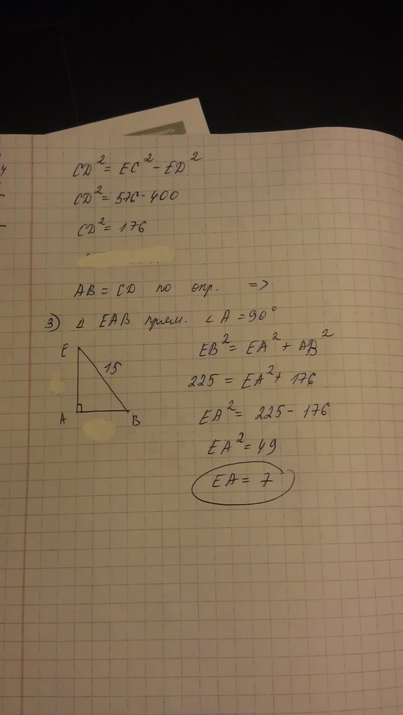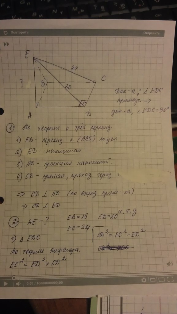 АВСД прямоугольник. Отрезок АЕ перпендикулярен к плоскости АВС. ЕВ=15, ЕС=24, ЕД=20.Докажите, что треугольник ЕДС прямоугольный и найти АЕ.
