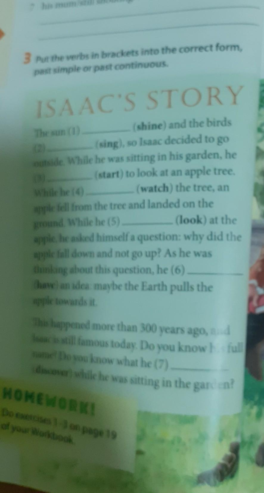 3 Преобразуйте глаголы в скобках в правильную форму прошедшего простого или непрерывного прошедшего времени. ИСТОРИЯ ИСААКА (светит) и птицы (поют), поэтому Исаак решил пойти e Пока он сидел в своем саду, он (начинает) смотреть на яблоню. (смотри) дерево, солнце () сикл от дерева и приземлился на н-й, пока он (5). Затем он добавляет себе вопрос: почему апи выросла вниз, а не поднялась? Обсуждая этот вопрос, он (6) выдвинул идею, что, может быть, Земля привлечет внимание, не так ли (9) (посмотрите) на то, что было сделано более 300 лет назад, а сегодня - 41 год. Знаете ли вы меня, вы знаете, что он (7), когда он сидел в гарнте