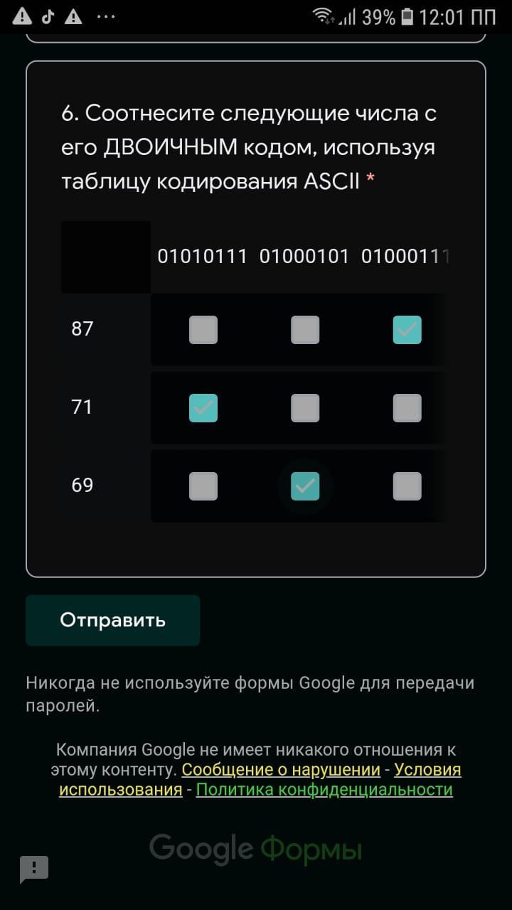 Соотнесите следующие числа с его ДВОИЧНЫМ кодом, используя таблицу кодирования ASCII *