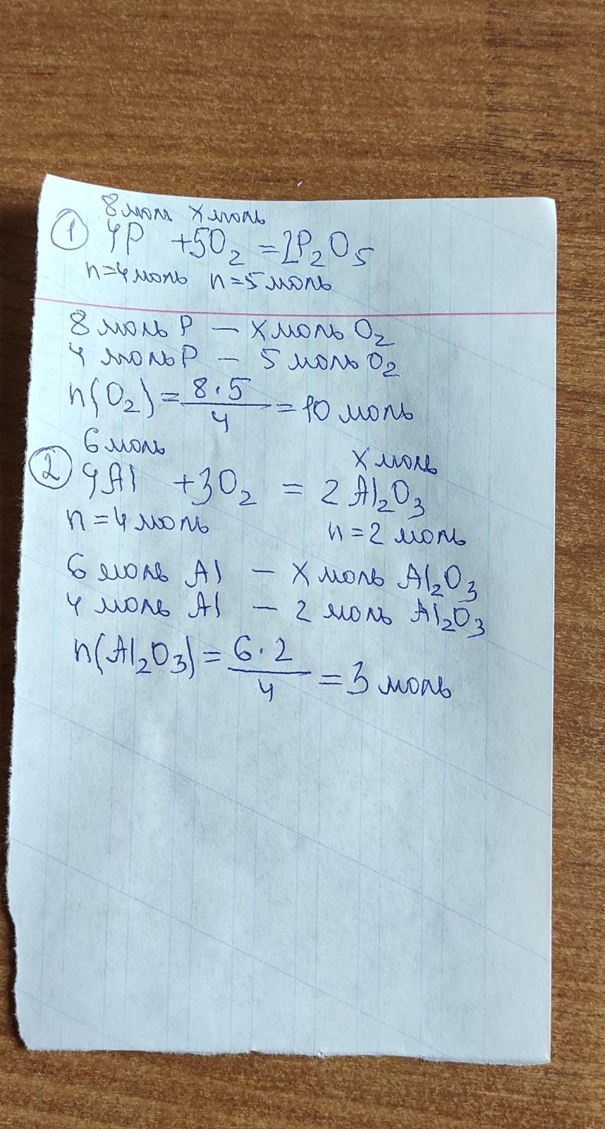 а) вычислить количество вещества кислорода, который необходим для сгорания фосфора количеством 8 моль. (Ответ: 10 моль)