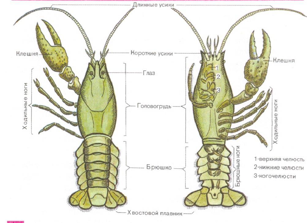 Для защиты от врагов и для захвата добычи служат две большие клешни, расположенные на головогруди.