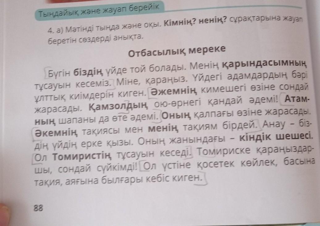 4. а) Мәтінді тыңда және оқы. Кімнің? ненің? сұрақтарына жауап
