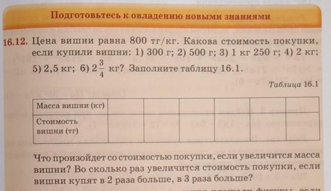 Цена вишни равна 800 тг/кг .Какова стоимость покупки ,если купили вишни :1)300г 2)500г 3)1кг 250 г 4)2 кг 5)2,5 кг 6)2 3/4 кг?Заполните таблицу 16.1