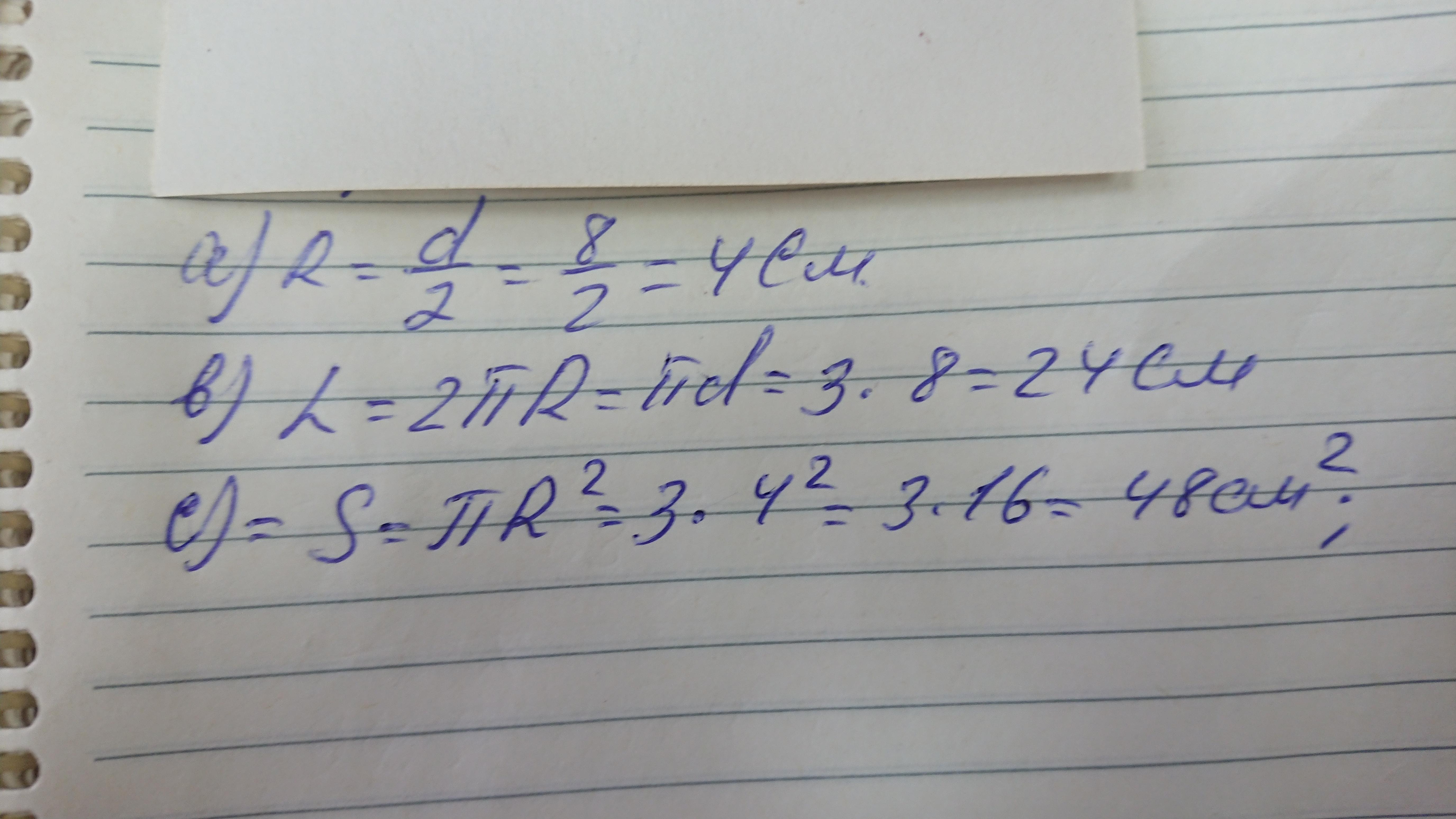 Диаметр окружности равен 8 см (π≈3).Запишите формулы и найдите