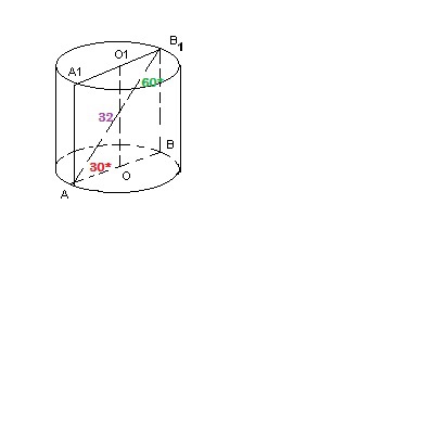 Диагональ осевого сечения цилиндра равна 32см. Угол между этой диагонали и плоскостью основания 30. Вычислить длину высоты, и площадь основания цилиндра