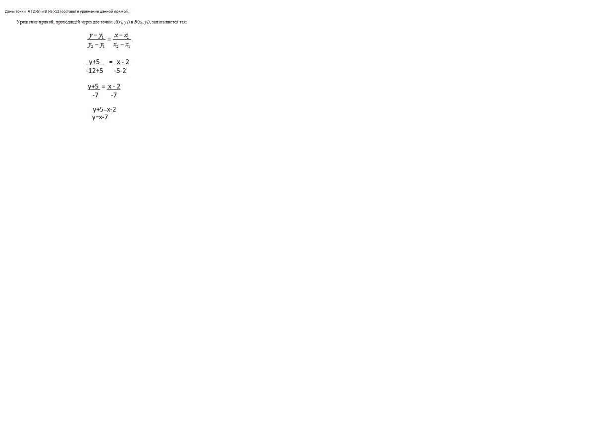 2) прямая у=кх+b проходит через точки: А (2;-5) и В (-5;-12) составьте уравнение данной прямой.