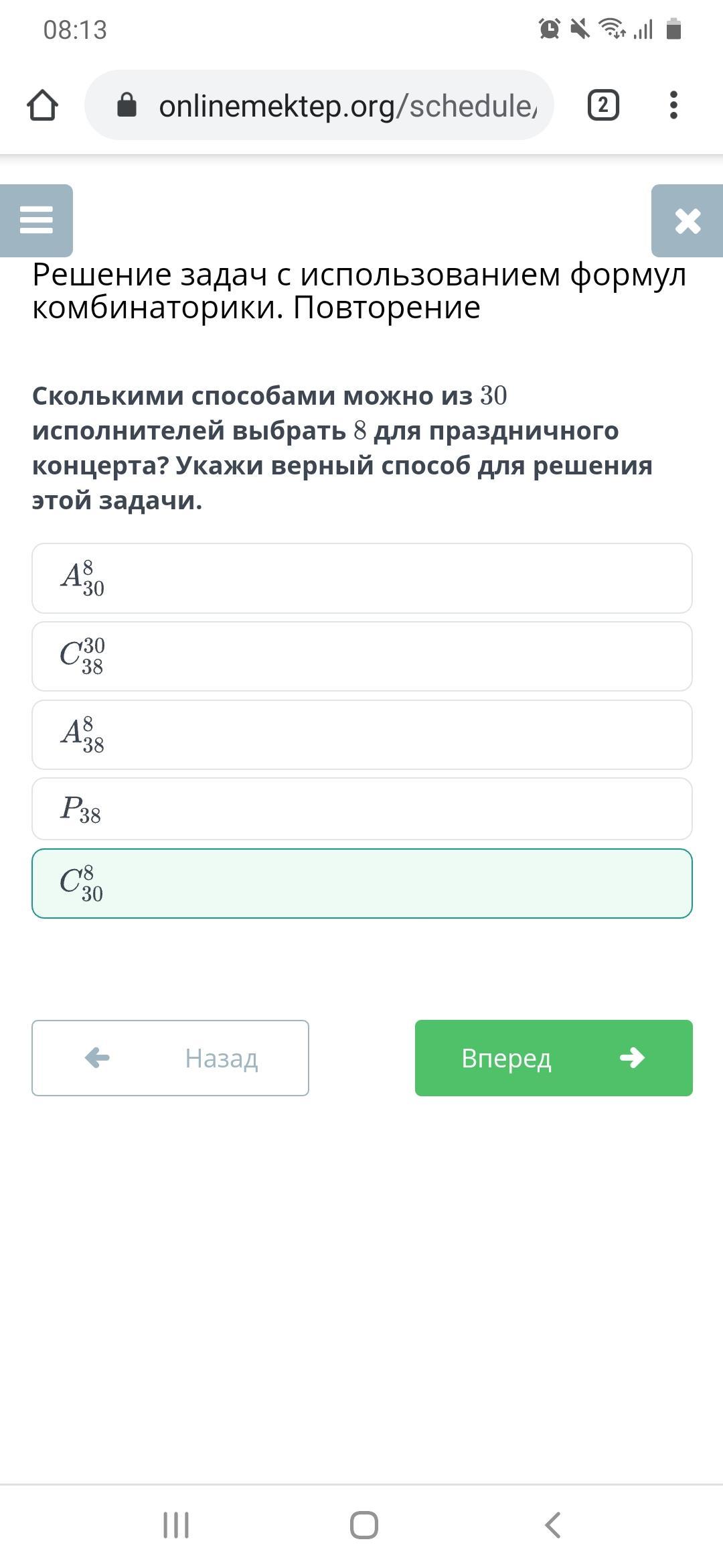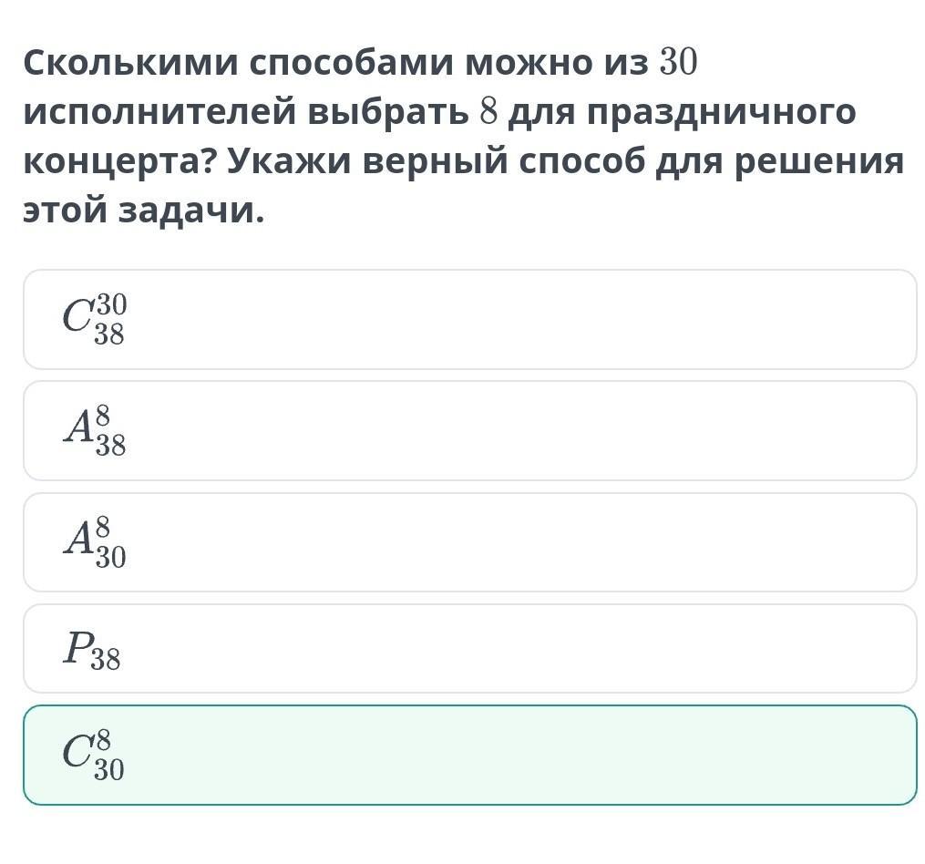 Сколькими способами можно из 30 исполнителей выбрать 8 для праздничного концерта? Укажи верный способ для решения этой задачи.