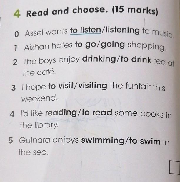 5 Gulnara enjoys swimming/to swim in