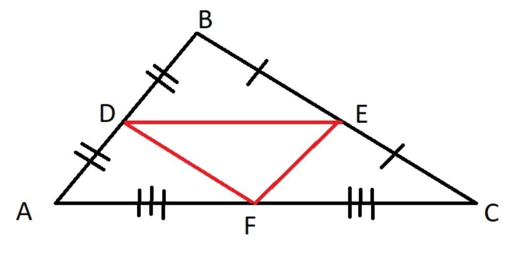 Так как треугольник DEF вписан в ∆АВС с середин сторон, то по правилам средней линии треугольника, средняя линия параллельная одной из его сторон равна половине этой стороны.