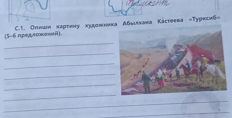 Описание Картины:Эта картина очень красивая,в этой картине я вижу людей с лошадями,которые ждут остановки поезда.Некоторые ездят на верблюдах,а некоторые дожидаясь остановки поезда пасутся своих лошадей.