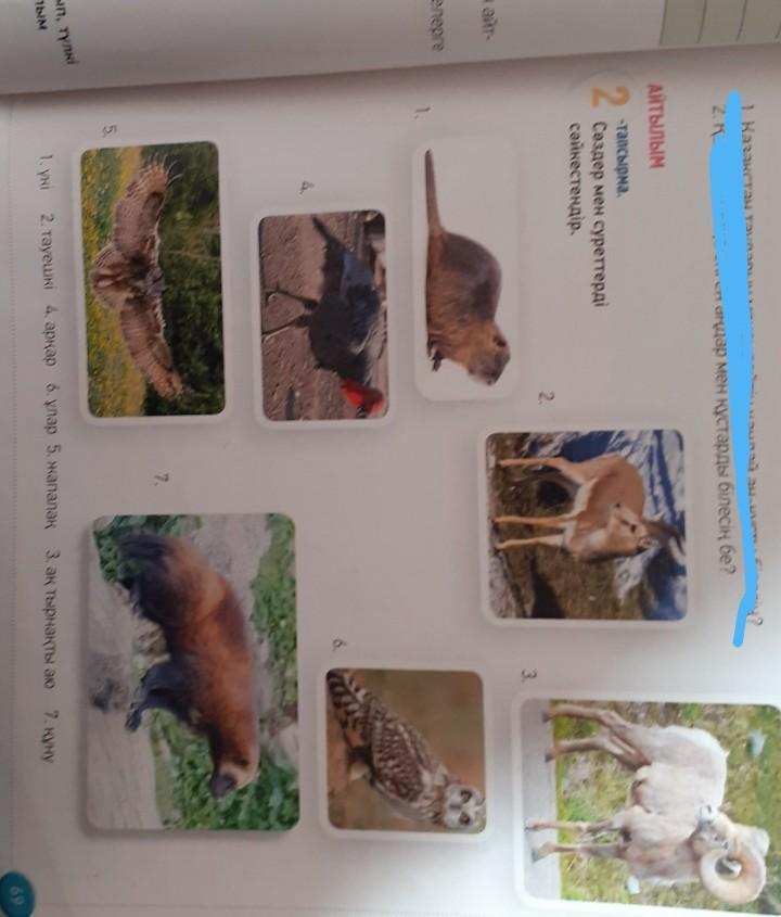 1. укi 2. тауешкі 4. арқар б. ұлар 5 жапалақ 3. ақ тырнақты ак 7. құну