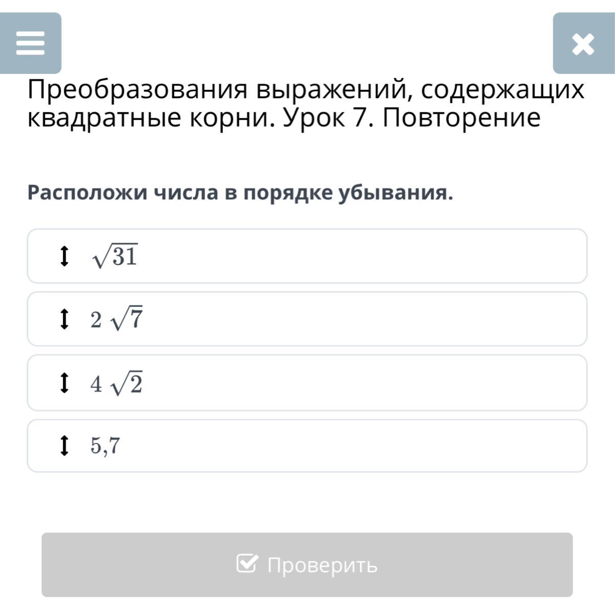 2V7=V(4*7)=V28, 4V2=V(16*2)=V32 (V -корень), 5,7=V32,49