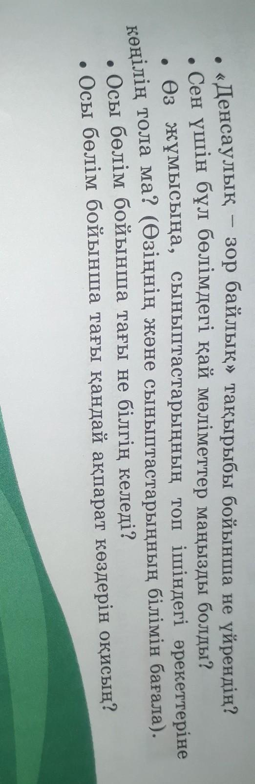 Мен біздің денсаулығыңыздың өте маңызды екенін және өзімізді күтіп ұстау керектігін,барынша пайдалы тағамдарды тұтыну керектігін үйрендім.