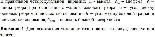Т.к. пирамида правильная, следует угол между апофемой и основанием равен 90°. По теореме Пифагора находим половину длины ребра при основании, а потом и саму длину ребра основания.