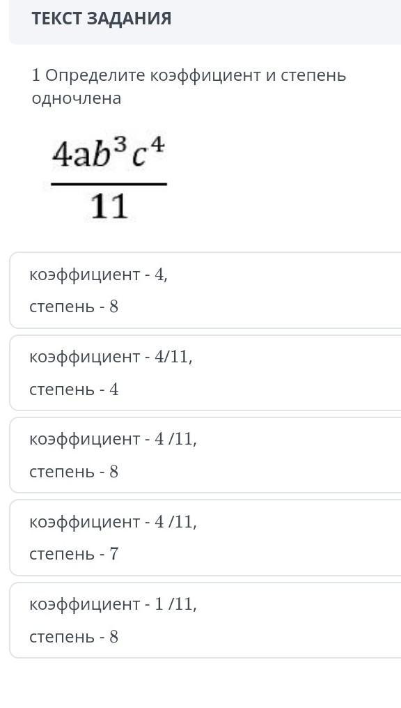 Коэффициент данного одночлена – 4/11, степень – 1 + 3 + 4 = 8.