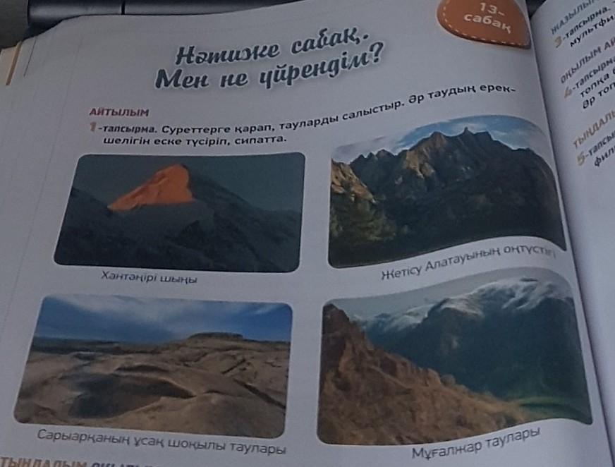 1-тапсырма. Суреттерге қарап, тауларды салыстыр. Әр таудың ерек-