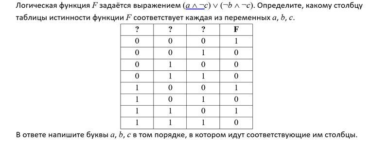 Заметим, что утверждение ложно, если а=0 и в=1 или с=1. Тогда рассмотрим таблицу и если в каком-то столбце при всех значениях 1 утверждение ложно, то с может стоять в этом столбце. 1-нет. 2-нет. 3-да. 3 столбец единственный подходящий для с =>с там, а а и в стоят в 1 и 2. Рассмотрим еслли а стоит в 1, тогда в во 2 и наоборот. Тогда по нашей логике, нужно найти такой вариант, если при а=0 и в=1 утверждение ложно. Рассмотрели и доказали вариант из ответ
