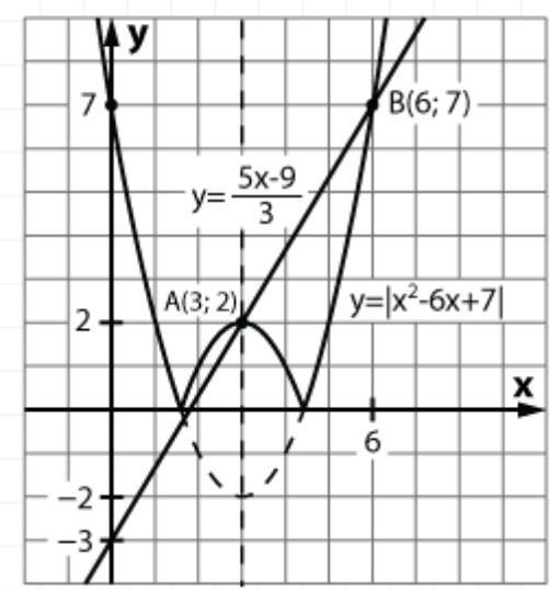 3) Судя по чертежу, графики пересекаются в двух точках — А(3; 2) и В(6; 7). Подставив абсциссы этих точек x = 3 и x = 6 в заданное уравнение, убеждаемся, что и при том и при другом значении получается верное числовое равенство. Значит, наша гипотеза подтвердилась — уравнение имеет два корня: x = 3 и x = 6. *Ответ: 3; 6.*