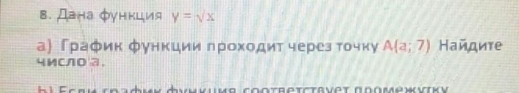 график функции у= корень х проходит через точку А (а;7) найдите число а срочнооооооо