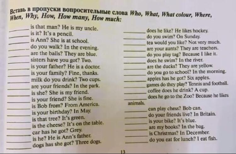 «Вставь в пропуски вопросительные слова Who, What, What colour, Where, When, Why, How, How many, How much»