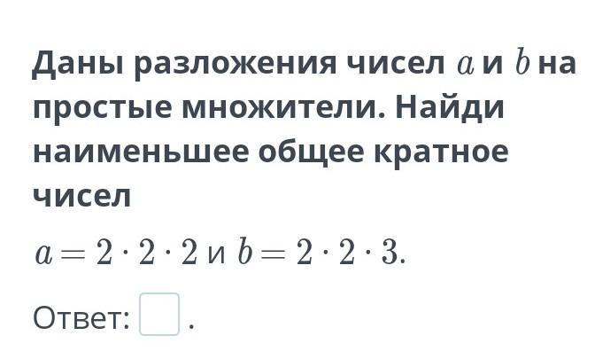 даны разложения чисел a и b на простые множители .Найди наименьшее общее кратное число a=2•2•2 и b=2•2•3