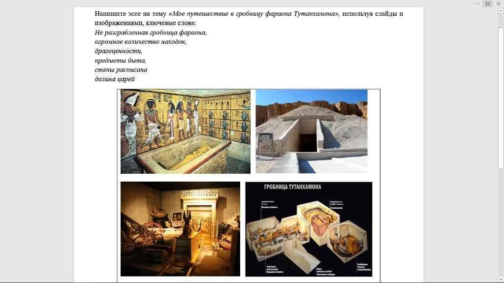 Напишите эссе на тему «Мое путешествие в гробницу фараона Тутанхамона», используя иллюстрации, ключевые слова и выражения