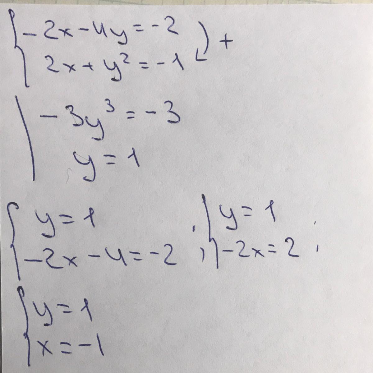решите систему уравнения методом сложения; -2х - 4у = -2 и 2х +у^2 = -1