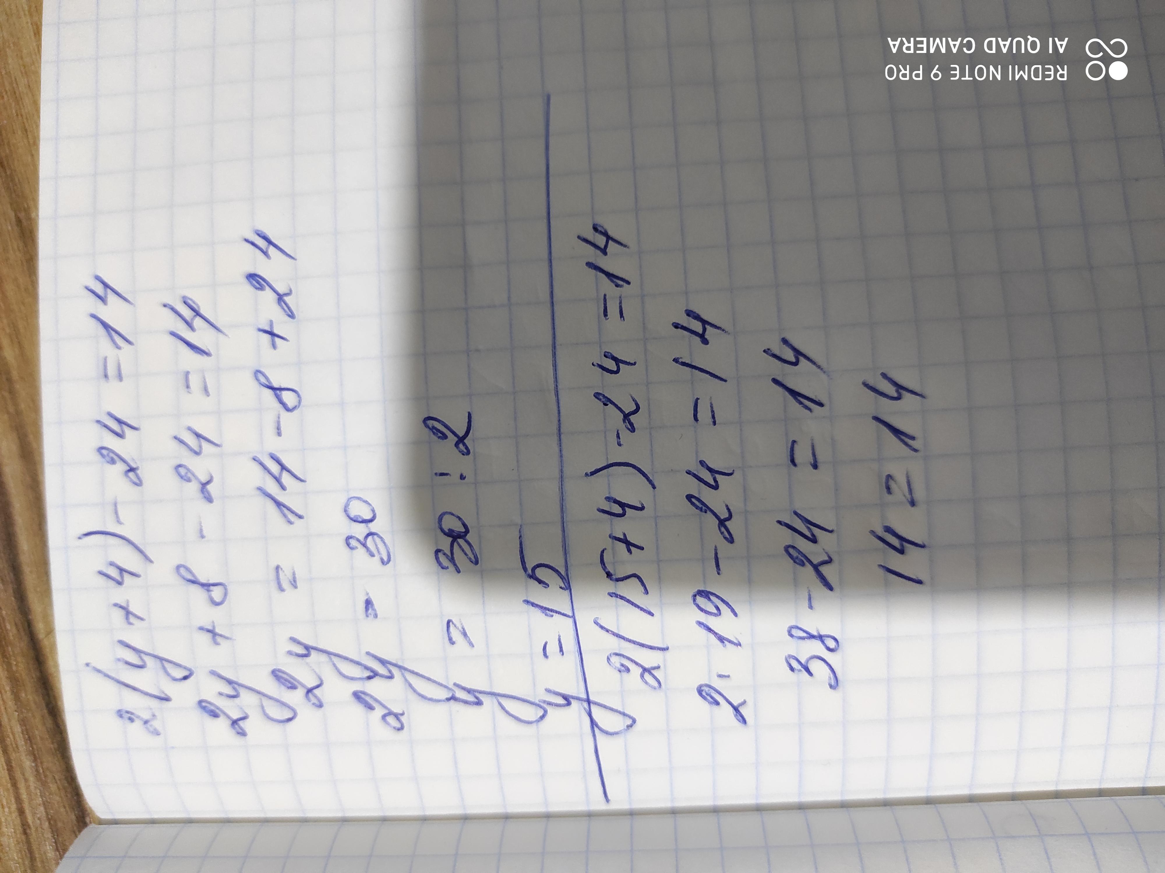Решите уравнение и сделайте проверку 2(у+4)-24=14 помогите пж это СОЧ даю 20 балов