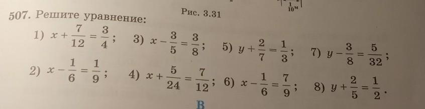 1)x+7/12=3/4 12x+7=9 12x=2. x=1/6. 2)x-1/6=1/9 18x-3=2 18x=5 x=5/18 3)x-3/5=3/8 40x-24=15 40x=39 x=39/40 4)x+5/24=7/12 24x+5=14 24x=9 x=3/8 5)y+2/7=1/3 21y+6=7 21y=1 y=1/21 6)x-1/6=7/9 18x-3= 14 18x=17 x= 17/18 7)y-3/8=5/32 32y-12=5 32y=17 y=17/32 8)y+2/5=1/2. 10y+4=5 10y=9 y=9/10 это для тех кто ничего не понял в ответе