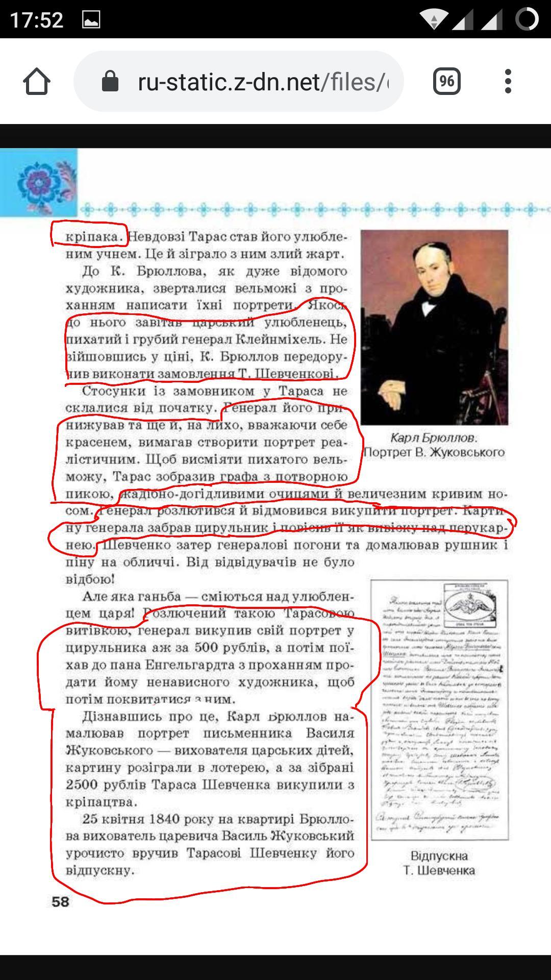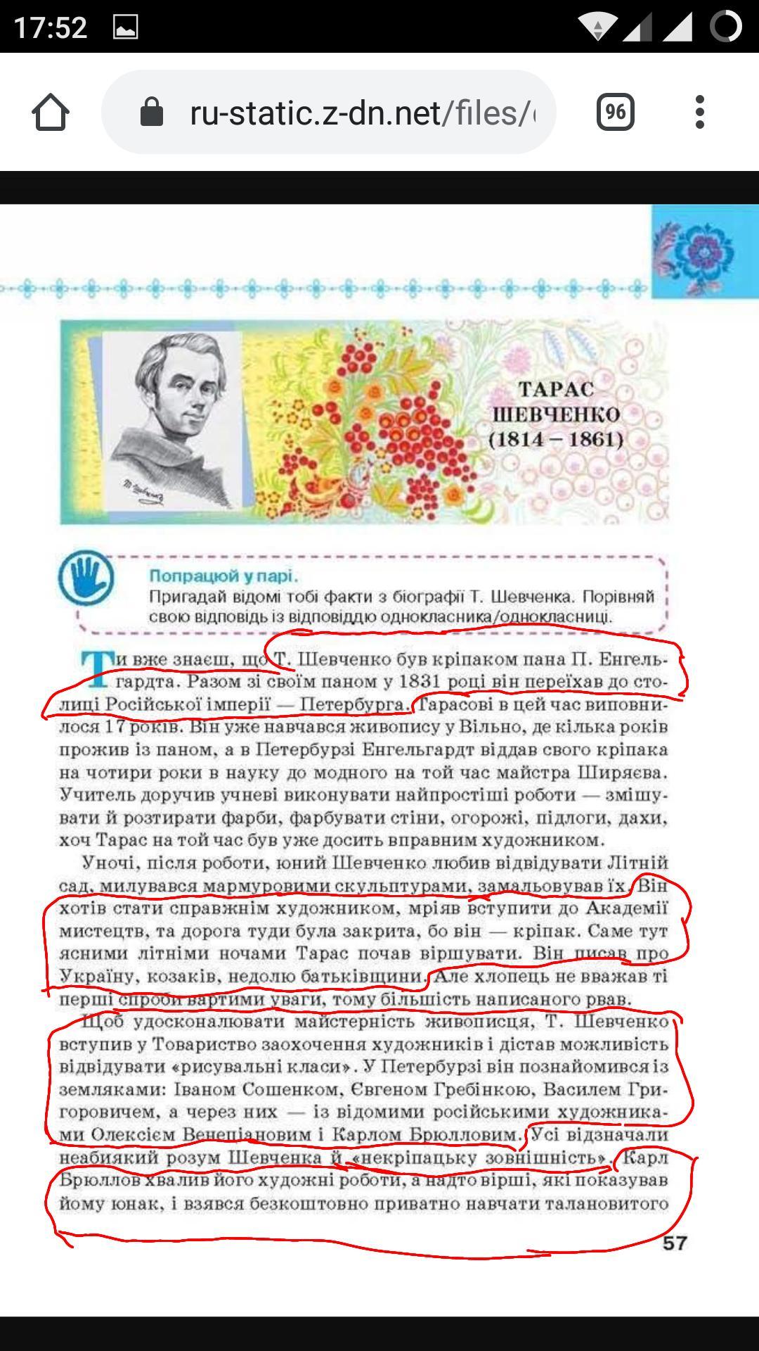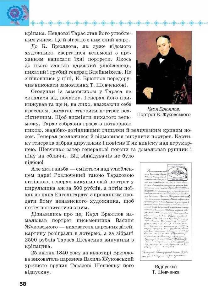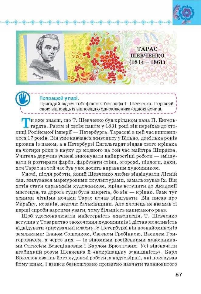Тарас Шевченко народився у 1814 році в селі Моринці Черкаської області, в сім’ї кріпосного селянина Григорія Івановича Шевченка. У Тараса було 2 брати і 4 сестри. Юний талант рано став сиротою — мати померла, коли йому було 9 років, батько — у 12 років. Дитинство Шевченка провів у селах Моринці та Кирилівка, які належали його поміщику, генерал-лейтенанту Василю Васильовичу Енгельгардту. Інтерес до малювання і поезії у Тараса Шевченка проявився з самого дитинства. У 8-річному віці хлопчик поступає на службу до місцевого вчителя-дяка Павла Рубана, де і навчається грамоті.На 16 році його життя він потрапляє в число прислуги поміщика Енгельгардта, спочатку в ролі кухарчука, потім козачка. Помітивши у Тараса пристрасть до живопису, поміщик вирішує зробити його придворним художником. Він віддає свого кріпака в навчання викладачеві Віленського університету — портретисту Яну Рустему. У Вільні юний Тарас пробув 1,5 року.