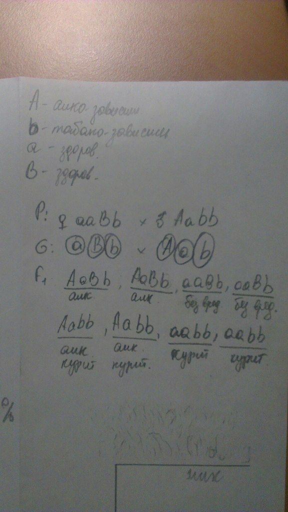 Алкогольная зависимость определяеться доминантным аутосомным геном (А), а потребность в курении табака-сцепленным с полом рецессивным геном (b). Курящий и пьющий мужчина женится на женщине,которая не курит и не пьет.Мужчина гетрозиготен по гену алкоголизма,а женщина гетрозиготна по гену табакокурения.