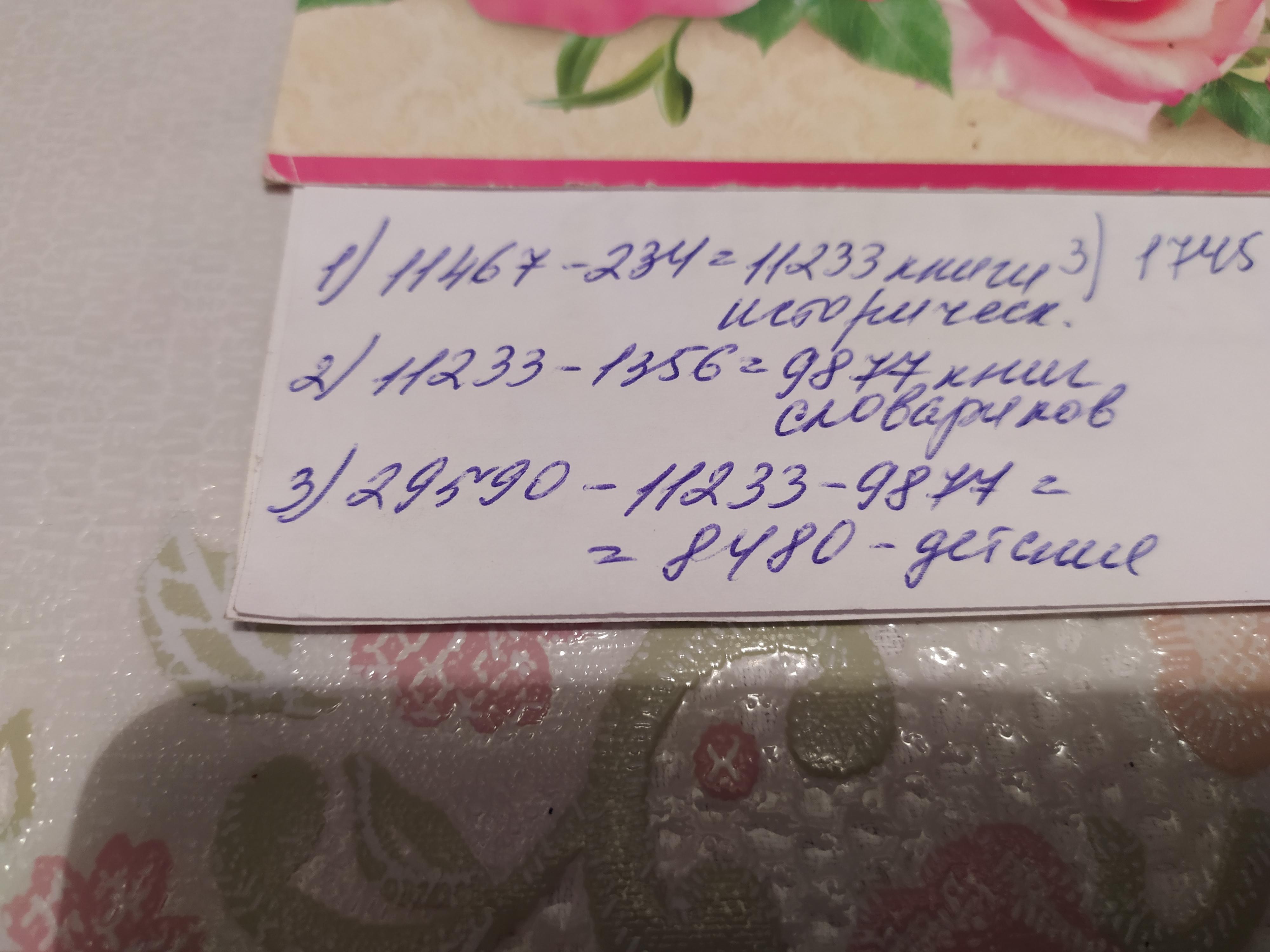 В библиотеке 29590 книг.Из них 11467 литературных.Исторических меньше чем литературных на 234.А словариков меньше на 1356 чем исторических.Остальные детские книги.Сколько детских книг?