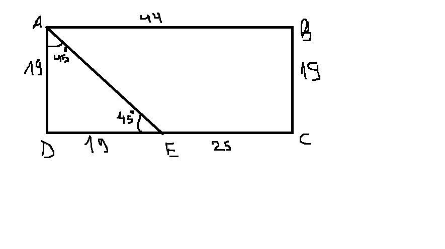 Биссектриса делит прямой угол на два по 45, и получаем равнобедренный прямоугольный треугольник ADE (равнобедренный он например потому что у него два угла равны). Дальше из рисунка находим периметр. CD=DE+EC=AB=44. AD=BC=19. P=2*44+2*19=126см