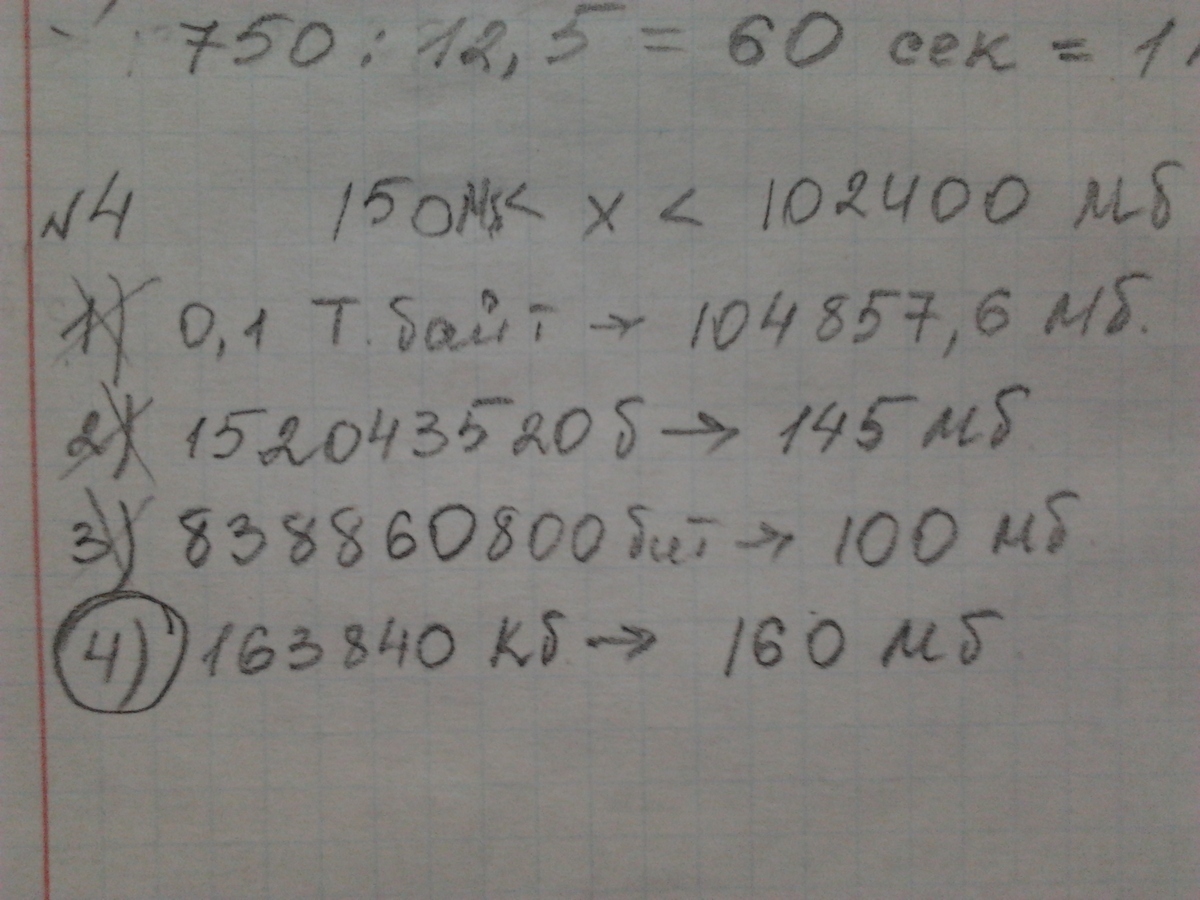 Укажите X,удовлетворяющий условию 150 Мб<X<100Гб(о,1 Тбайт.,152043520 байт.,838860800 бит.,163840 Кбайт)