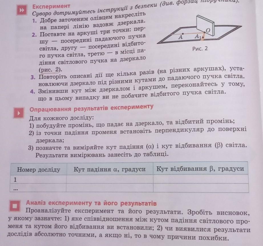 Кут падіння світлового променя дорівнює куту відбивання. Результати дослідів могли виявитися неточними через випадкову похибку — неможливо прикласти транспортир ідеально рівно до променя, також може бути і систематична похибка — неможливо знайти транспортир з ідеально точною шкалою, щоб виміряти кут падіння променя. Абсолютна похибка прямого вимірювання враховує і випадкову, і систематичну похибку, зумовлену процесом вимірювання.