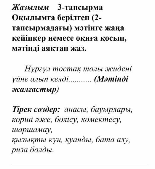 оқылымға берілген ( 2 тапсырмадағы) мәтінге жаңа кейіпкер немесе оқиға косып,мәтінді аяқтап жаз