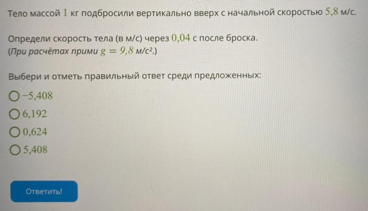 Тело массой 1 кг подбросили вертикально вверх с начальной скоростью 5,8 м/с.