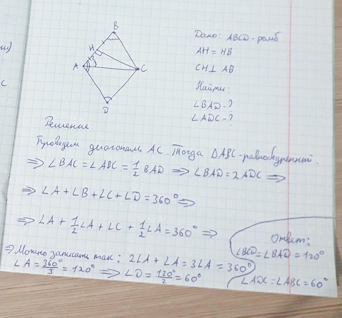 Если высота ромба из тупого угла делит его сторону пополам, то получим прямоугольный треугольник в котором один из катетов равен половине гипотенузы, таким образом углы ромба равны 60°, 120°, 60°, 120°.