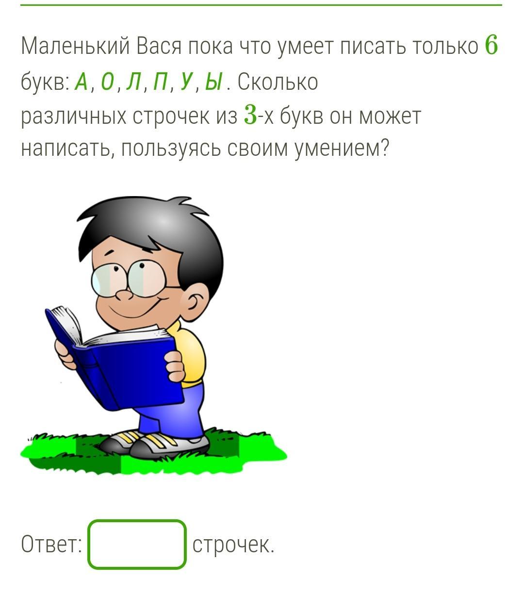 120×6=720 разных строк из трёх букв может написать Вася умеющий писать только шесть букв!