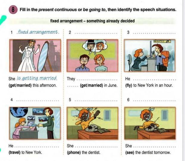 she is getting married.They are getting married in June.He is flying to New York.He is traveling to New York in an hour.She phoning the dentist.She seeing the detist tomorrow