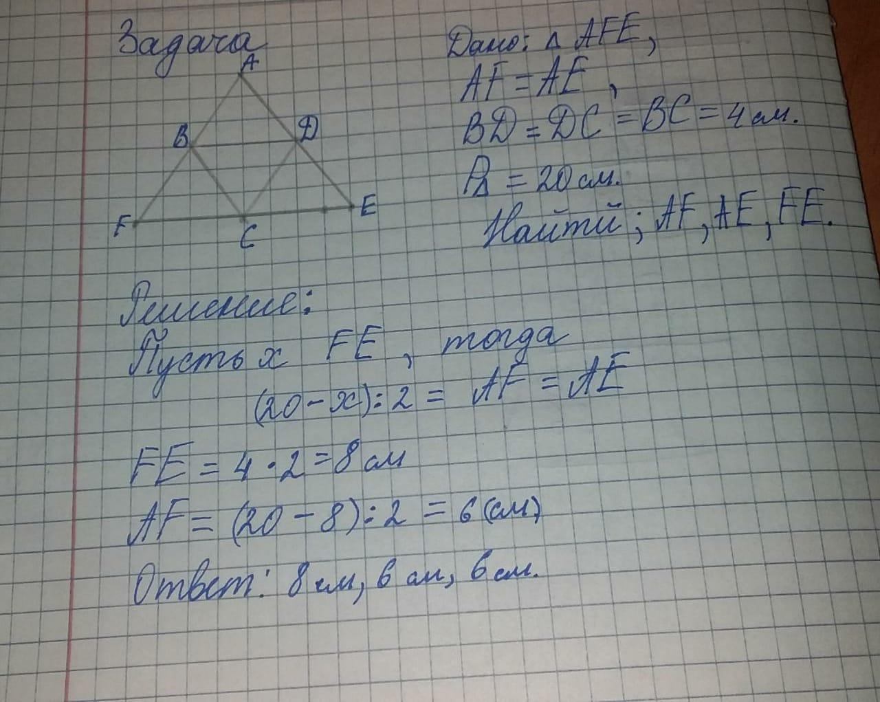 Средняя линия равнобедренного треугольника, параллельная основанию, равна 4см. Найдите стороны треугольника, если его периметр равен 20 см