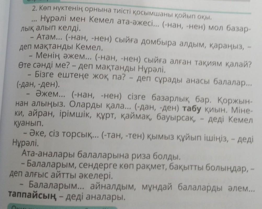2. Көп нүктенің орнына тиісті қосымшаны қойып оқы.