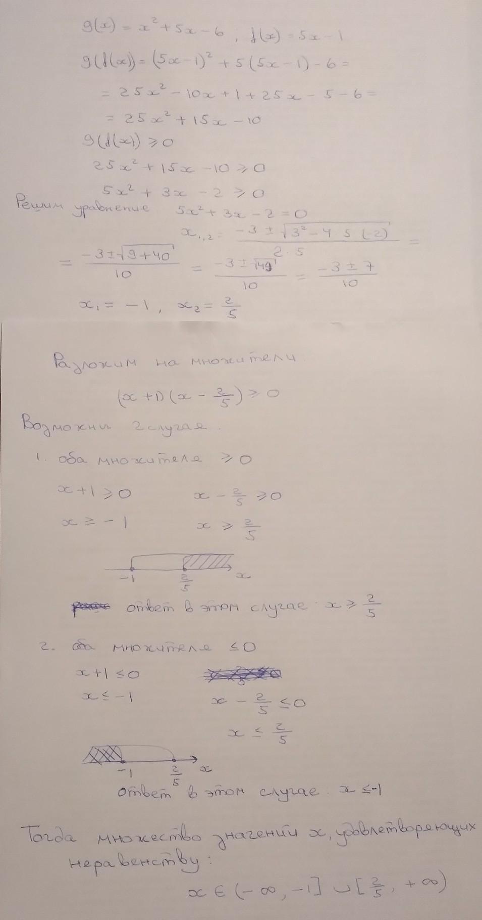 даны функции g(x)=x² +5x-6 и f(x) =5x -1 найдите множество значений x удовлетворяющих неравенству g(f(x))≥0