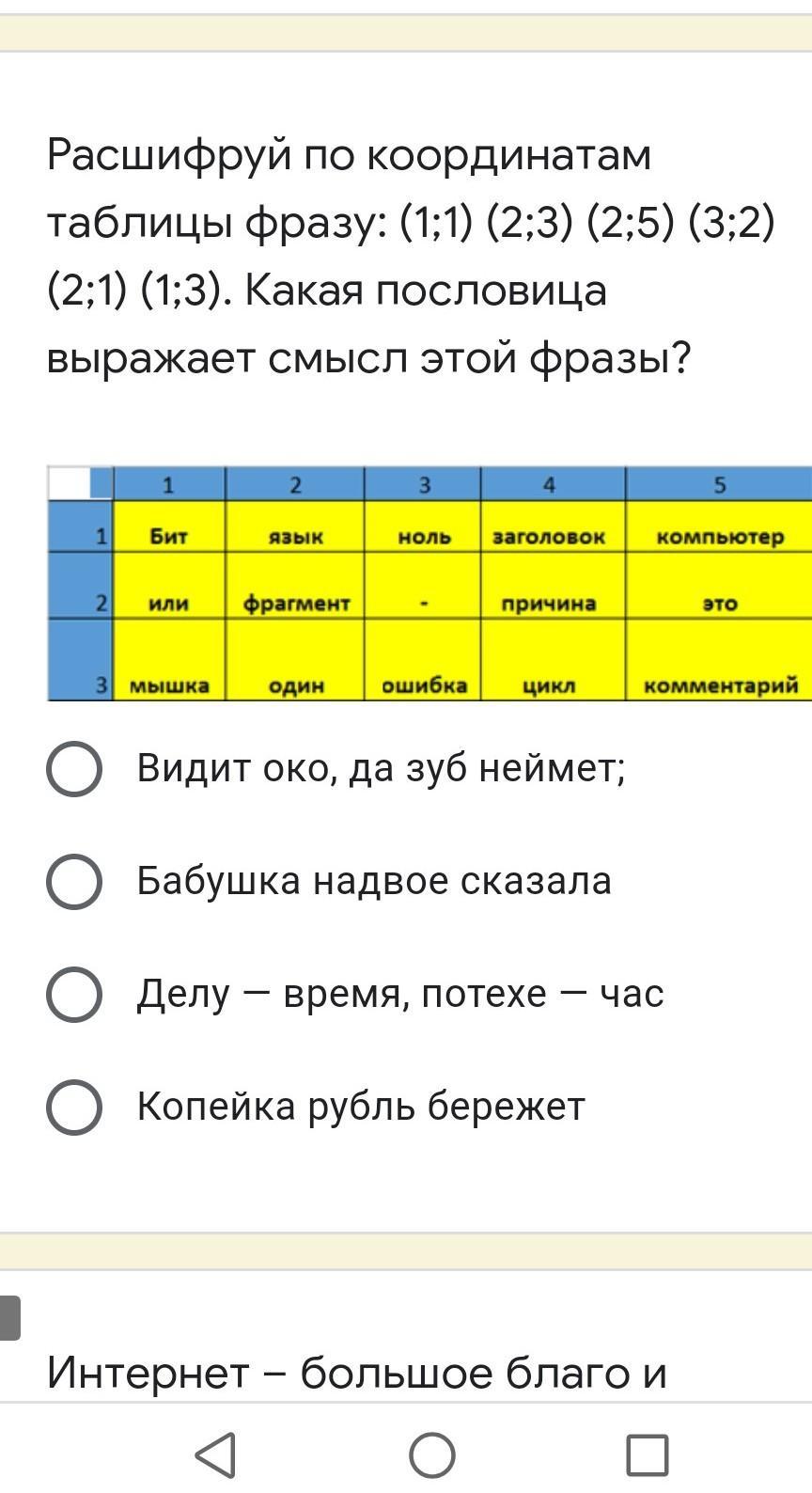 Расшифруй по координатам таблицы фразу: (1;1) (2;3) (2;5) (3;2) (2;1) (1;3). Какая пословица выражает смысл этой фразы?