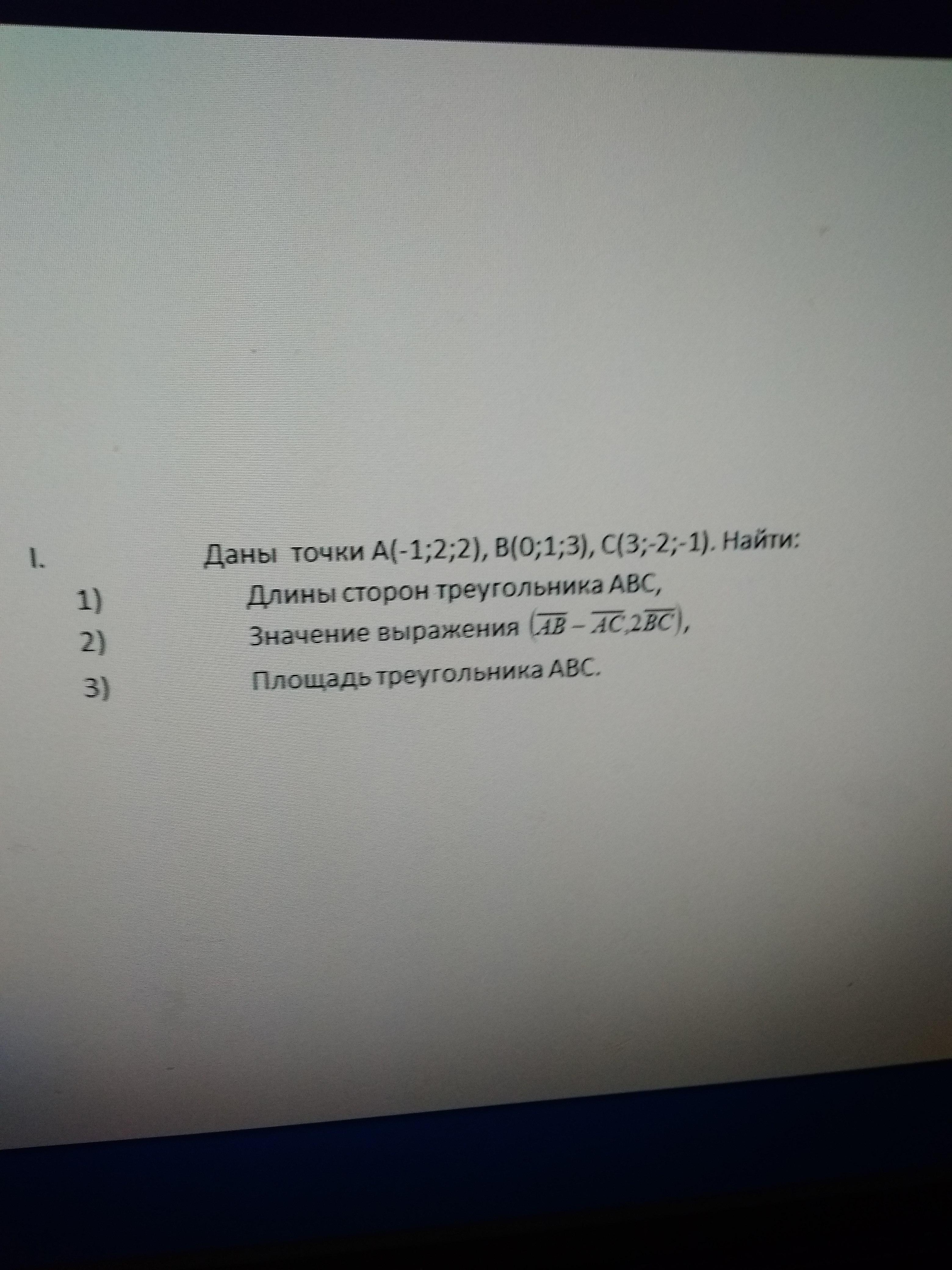 Вектор АВ-АС имеет координаты (-3,3,4), вектор 2BC имеет координаты (6,-6,-8), тогда их скалярное произведение (АВ-АС,2ВС)=-18-18-32=-68
