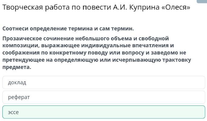 Прозаическое сочинение небольшого объема и свободной композиции, выражающее индивидуальные впечатления и соображения по конкретному поводу или вопросу и заведомо не претендующее на определяющую или исчерпывающую трактовку предмета.