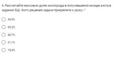 Рассчитайте массовую долю кислорода в получившемся оксиде азота в задании 3(a). Фото решения задачи прикрепите к уроку.
