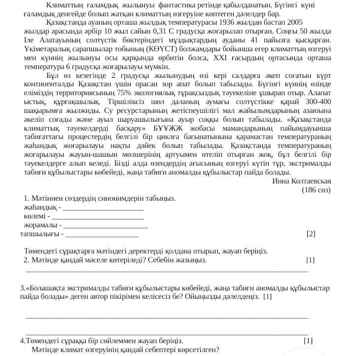 3.«Болашақта экстрималды табиғи құбылыстары көбейеді, жаңа табиғи аномалды құбылыстар пайда болады» деген автор пікірімен келісесіз бе? Ойыңызды дәлелдеңіз. [1]