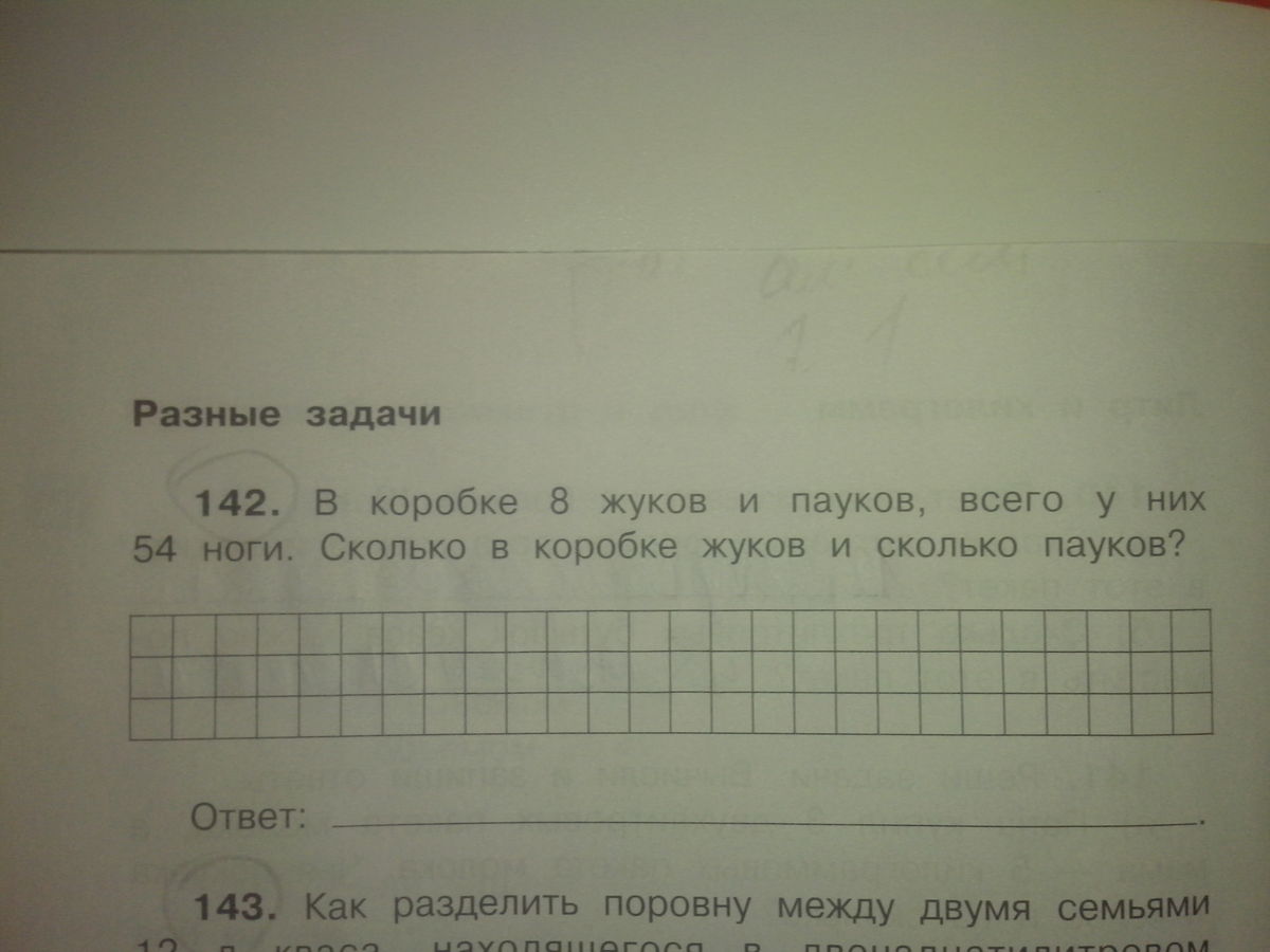 в коробке 8 жуков и пауков, всего у них 54 ноги. Сколько в коробке жуков и сколько пауков.